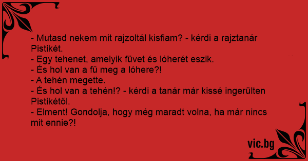 - És hol van a tehén!? - kérdi a tanár már kissé ingerülten Pistikétől.
