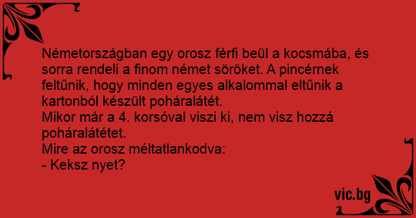 Németországban egy orosz férfi beül a kocsmába, és sorra rendeli a finom német söröket. A pincérnek feltűnik, hogy minden egyes alkalommal eltűnik a kartonból készült poháralátét.