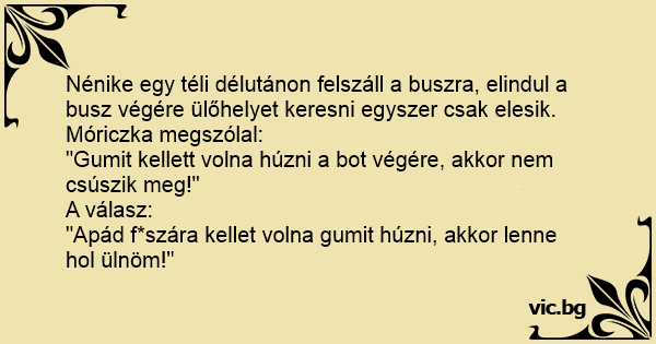 Nénike egy téli délutánon felszáll a buszra, elindul a busz végére ülőhelyet keresni egyszer csak elesik. Móriczka megszólal: