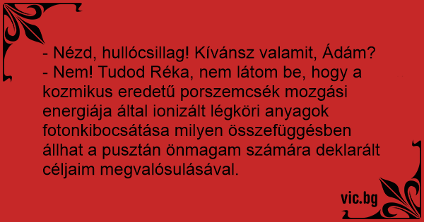 - Nem! Tudod Réka, nem látom be, hogy a kozmikus eredetű porszemcsék mozgási energiája által ionizált légköri anyagok fotonkibocsátása milyen összefüggésben állhat a pusztán önmagam számára deklarált céljaim megvalósulásával.