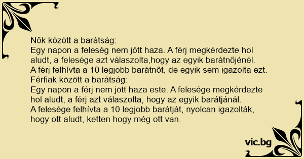 Egy napon a feleség nem jött haza. A férj megkérdezte hol aludt, a felesége azt válaszolta,hogy az egyik barátnőjénél.