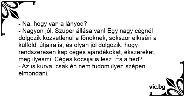 - Nagyon jól. Szuper állása van! Egy nagy cégnél dolgozik közvetlenül a főnöknek, sokszor elkíséri a külföldi útjaira is, és olyan jól dolgozik, hogy rendszeresen kap céges ajándékokat, ékszereket, meg ilyesmi. Céges kocsija is lesz. És a tied?