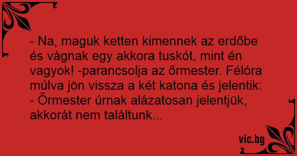 - Na, maguk ketten kimennek az erdőbe és vágnak egy akkora tuskót, mint én vagyok! -parancsolja az őrmester. Félóra múlva jön vissza a két katona és jelentik: