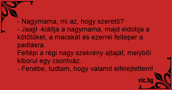 Unoka megkérdezi: - Mondd nagymama, mi az a szerető? Nagymama felsikít, elhajítja a kötést, felpattan, átgázol a macskán, felrohan a padlásra, feltépi a gardróbajtót, kizuhan egy csontváz. - A...