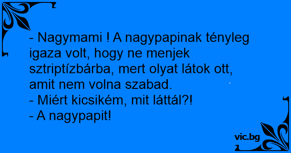 - Nagymami ! A nagypapinak tényleg igaza volt, hogy ne menjek sztriptízbárba, mert olyat látok ott, amit nem volna szabad.