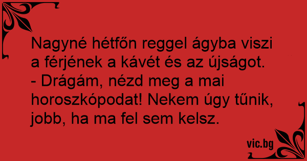 - Drágám, nézd meg a mai horoszkópodat! Nekem úgy tűnik, jobb, ha ma fel sem kelsz.