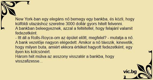 Három hét múlva az asszony visszatér a bankba, hogy visszafizesse a kölcsönt és a 21 dolláros kamatot. Az igazgató így szól: