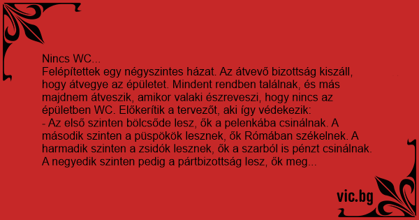 - Az első szinten bölcsőde lesz, ők a pelenkába csinálnak. A második szinten a püspökök lesznek, ők Rómában székelnek. A harmadik szinten a zsidók lesznek, ők a szarból is pénzt csinálnak. A negyedik szinten pedig a pártbizottság lesz, ők meg minden szart egymásra kennek...