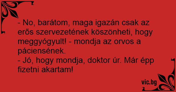 - No, barátom, maga igazán csak az erős szervezetének köszönheti, hogy meggyógyult! - mondja az orvos a páciensének.