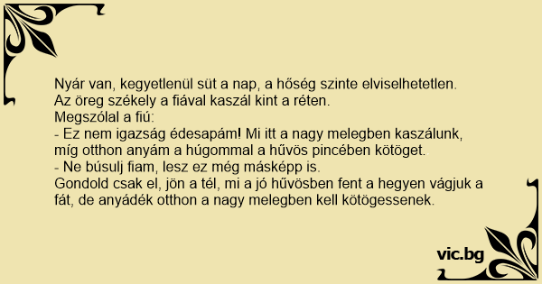 - Ez nem igazság édesapám! Mi itt a nagy melegben kaszálunk, míg otthon anyám a húgommal a hűvös pincében kötöget.