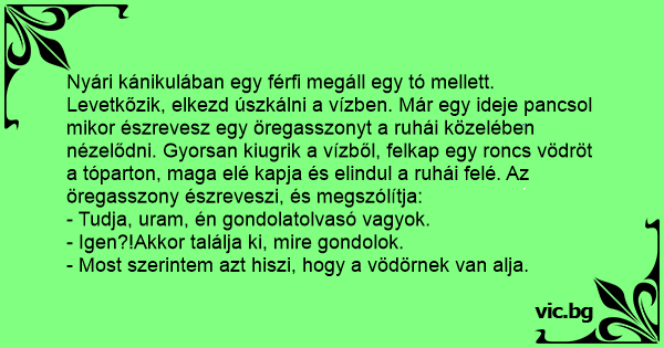 Nyári kánikulában egy férfi megáll egy tó mellett. Levetkőzik, elkezd úszkálni a vízben. Már egy ideje pancsol mikor észrevesz egy öregasszonyt a ruhái közelében nézelődni. Gyorsan kiugrik a vízből, felkap egy roncs vödröt a tóparton, maga elé kapja és elindul a ruhái felé. Az öregasszony észreveszi, és megszólítja:
