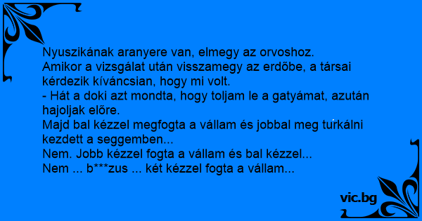 - Hát a doki azt mondta, hogy toljam le a gatyámat, azután hajoljak előre.