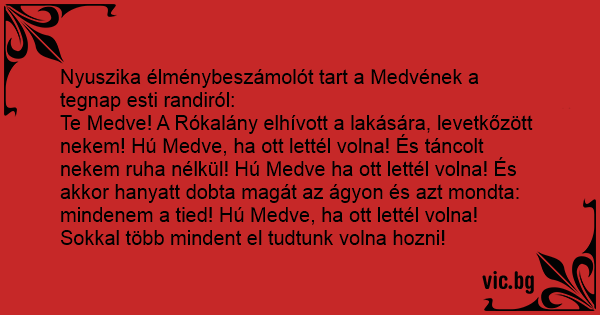 Te Medve! A Rókalány elhívott a lakására, levetkőzött nekem! Hú Medve, ha ott lettél volna! És táncolt nekem ruha nélkül! Hú Medve ha ott lettél volna! És akkor hanyatt dobta magát az ágyon és azt mondta: mindenem a tied! Hú Medve, ha ott lettél volna! Sokkal több mindent el tudtunk volna hozni!