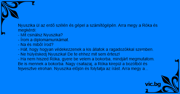Nyuszika ül az erdő szélén és gépel a számítógépén. Arra megy a Róka és megkérdi:
