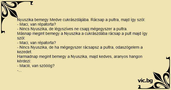 Nyuszika bemegy Medve cukrászdájába. Rácsap a pultra, majd így szól:
