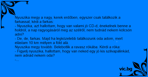 Nyuszika megy a nagy, kerek erdőben, egyszer csak találkozik a farkassal, kédi a farkas:
