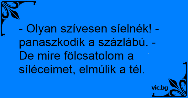 - Olyan szívesen síelnék! - panaszkodik a százlábú. - De mire fölcsatolom a síléceimet, elmúlik a tél.