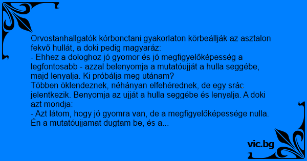 - Ehhez a dologhoz jó gyomor és jó megfigyelőképesség a legfontosabb - azzal belenyomja a mutatóujját a hulla seggébe, majd lenyalja. Ki próbálja meg utánam?