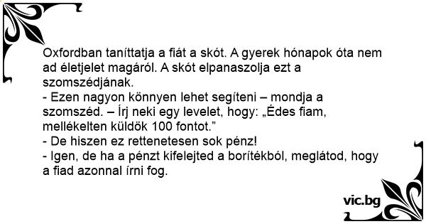 Oxfordban taníttatja a fiát a skót. A gyerek hónapok óta nem ad életjelet magáról. A skót elpanaszolja ezt a szomszédjának.