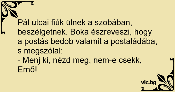 - Menj ki, nézd meg, nem-e csekk, Ernő!