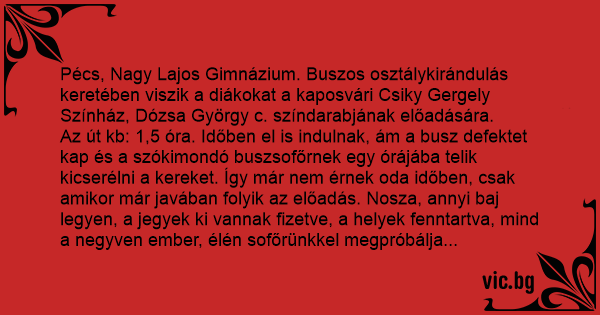 Pécs, Nagy Lajos Gimnázium. Buszos osztálykirándulás keretében viszik a diákokat a kaposvári Csiky Gergely Színház, Dózsa György c. színdarabjának előadására.