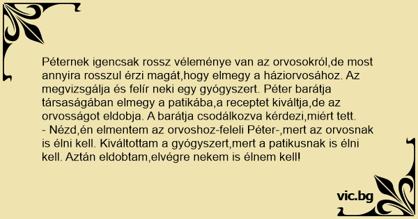 - Nézd,én elmentem az orvoshoz-feleli Péter-,mert az orvosnak is élni kell. Kiváltottam a gyógyszert,mert a patikusnak is élni kell. Aztán eldobtam,elvégre nekem is élnem kell!