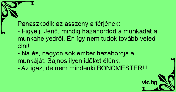 - Figyelj, Jenő, mindig hazahordod a munkádat a munkahelyedről. Én így nem tudok tovább veled élni!