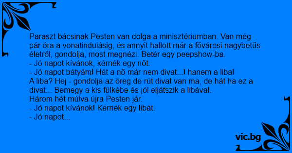 Paraszt bácsinak Pesten van dolga a minisztériumban. Van még pár óra a vonatindulásig, és annyit hallott már a fővárosi nagybetűs életről, gondolja, most megnézi. Betér egy peepshow-ba.