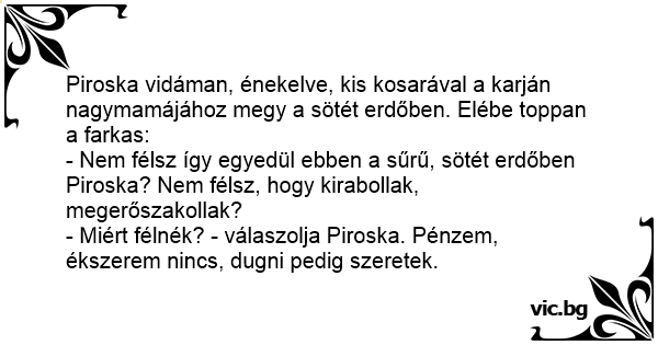 - Miért félnék? - válaszolja Piroska. Pénzem, ékszerem nincs, dugni pedig szeretek.