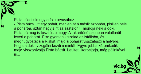 - Pista bácsi, itt egy pohár, menjen át a másik szobába, pisiljen bele a pohárba, aztán hagyja itt az asztalon! - mondja neki a doki.