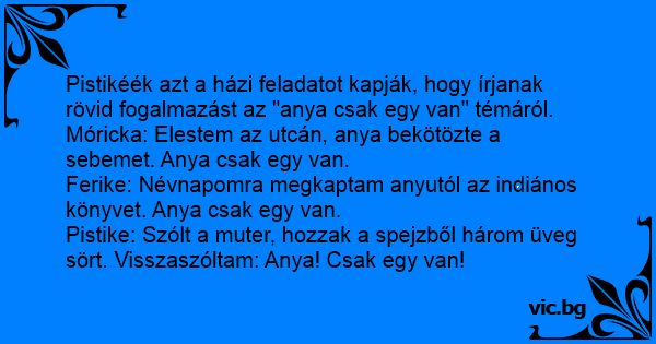 Pistikéék azt a házi feladatot kapják, hogy írjanak rövid fogalmazást az "anya csak egy van" témáról.