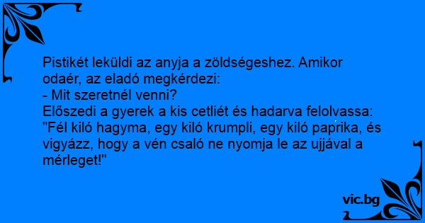 "Fél kiló hagyma, egy kiló krumpli, egy kiló paprika, és vigyázz, hogy a vén csaló ne nyomja le az ujjával a mérleget!"