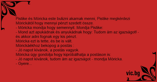 Pistike és Móricka este bulizni akarnak menni, Pistike megkérdezi Mórickától hogy mennyi pénzt szedett össze.