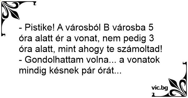 - Pistike! A városból B városba 5 óra alatt ér a vonat, nem pedig 3 óra alatt, mint ahogy te számoltad!