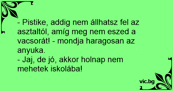 - Pistike, addig nem állhatsz fel az asztaltól, amíg meg nem eszed a vacsorát! - mondja haragosan az anyuka.