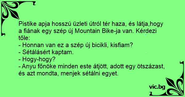 Pistike apja hosszú üzleti útról tér haza, és látja,hogy a fiának egy szép új Mountain Bike-ja van. Kérdezi tőle: