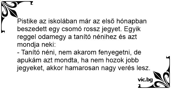 - Tanító néni, nem akarom fenyegetni, de apukám azt mondta, ha nem hozok jobb jegyeket, akkor hamarosan nagy verés lesz.