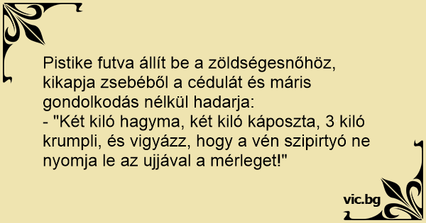 - "Két kiló hagyma, két kiló káposzta, 3 kiló krumpli, és vigyázz, hogy a vén szipirtyó ne nyomja le az ujjával a mérleget!"