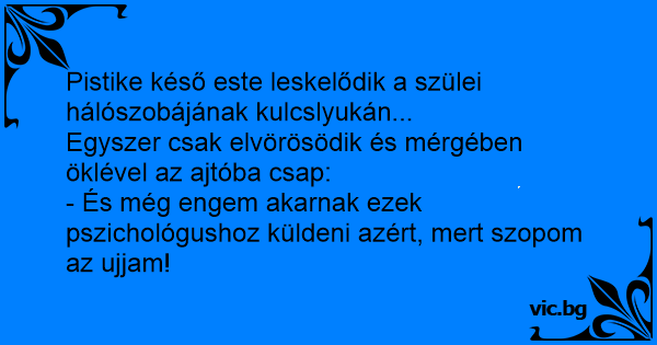69. Малко момиченце влиза в спалнята на родители - Божичко, - извиква детенцето, и вие искате да ме водите на доктор, защото съм си смучела пръста...! Влегува синот во спалната соба и ги гледа неговите во 69 поза. Una bambina passa davanti alla camera dei genitori e se ne va via scuotendo la testa e dicendo Joãozinho olhava pelo buraco da fechadura do quarto dos pais quando eles estavam transando. Seu irmãozinho de 5 anos queria saber o que estava acontecendo lá dentro. Respondeu Joãozinho: Un crío se levanta a las dos de la mañana a beber agua, y al pasar por la habitación de sus padres oye ruido y mira dentro. Los pilla haciendo un 69 y dice: - Joder, y me quieren llevar a mí al... Kalle hiipi vanhempien makuuhuoneeseen. Seurattuaan hetken tapahtumia hän karjaisi: "Ja minua kun oltiin viemässä psykiatrille kun imin peukaloa!" Un niñito encuentra a sus padres teniendo **** oral y les dice: Que lindos eh¡!... y a mi me llevan al psicólogo por que me chupo el dedo!!!! Två grabbar står och tjuvkikar genom nyckelhålet till sovrummet där mamman och pappan är i full gång. Lillebror knuffar undan sin storebror så att han också ska få se vad som händer och det är... Uhvati slucajno Perica mamu kako oralno zadovojava tatu. A on ce na to . Mamicu vam vasu a mene ste vodili kod pshihijatra zato sto sam sisao prst Улаза дете у спалну и гледа мама куде му га пуши на тату и ги вика: - Пи*ка ви материна како не ве е срам, а мене ме водите на психијатра што цицам палац!