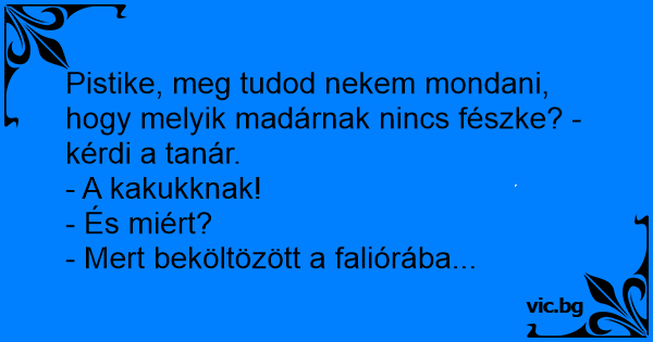 Welcher Vogel baut kein Nest, fragt der Lehrer. Fritzchen meldet sich, und sagt: Der Kuckuck. Richtig, sagt der Lehrer. Und warum nicht, fragt er Fritzchen. Weil er in einer Uhr wohnt.