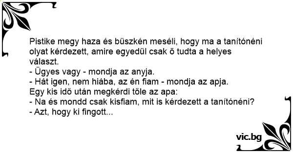 Pistike megy haza és büszkén meséli, hogy ma a tanítónéni olyat kérdezett, amire egyedül csak ő tudta a helyes választ.