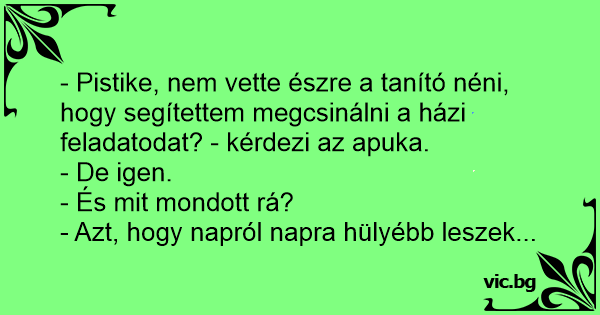 - Pistike, nem vette észre a tanító néni, hogy segítettem megcsinálni a házi feladatodat? - kérdezi az apuka.