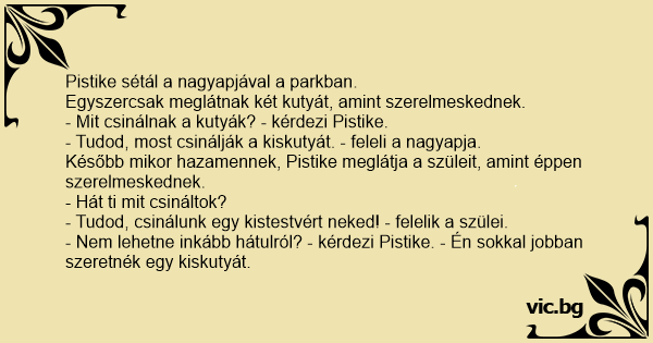 - Nem lehetne inkább hátulról? - kérdezi Pistike. - Én sokkal jobban szeretnék egy kiskutyát.