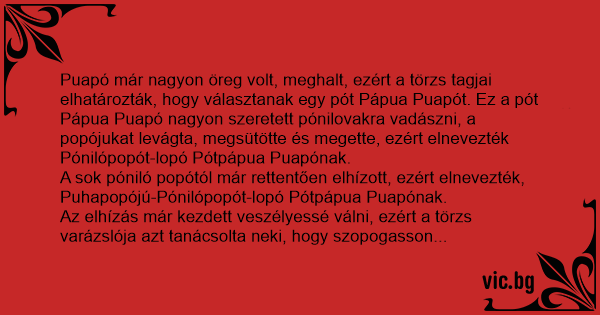 Puapó már nagyon öreg volt, meghalt, ezért a törzs tagjai elhatározták, hogy választanak egy pót Pápua Puapót. Ez a pót Pápua Puapó nagyon szeretett pónilovakra vadászni, a popójukat levágta, megsütötte és megette, ezért elnevezték Pónilópopót-lopó Pótpápua Puapónak.