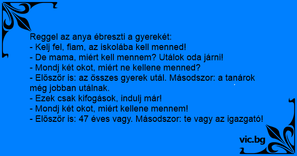 Reggel van. Az anya kelti a fiát. - Fiam, kelj fel, iskolába kell menned! - Nem akarok! - Mondj 2 nyomós érvet, hogy miért nem! - 1. Az összes gyerek utál, 2. Az összes tanár utál! - Ez nem nyomós...