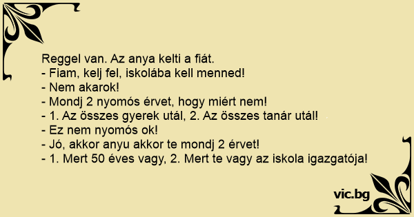 Reggel az anya ébreszti a gyerekét: - Kelj fel, fiam, az iskolába kell menned! - De mama, miért kell mennem? Utálok oda járni! - Mondj két okot, miért ne kellene menned? - Először is: az összes...