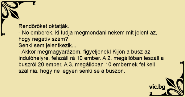 - Akkor megmagyarázom, figyeljenek! Kijön a busz az indulóhelyre, felszáll rá 10 ember. A 2. megállóban leszáll a buszról 20 ember. A 3. megállóban 10 embernek fel kell szállnia, hogy ne legyen senki se a buszon.