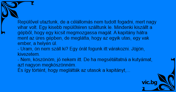 Repülővel utaztunk, de a célállomás nem tudott fogadni, mert nagy vihar volt. Egy kisebb repülőtéren szálltunk le. Mindenki kiszállt a gépből, hogy egy kicsit megmozgassa magát. A kapitány hátra ment az üres gépben, de meglátta, hogy az egyik utas, egy vak ember, a helyén ül.