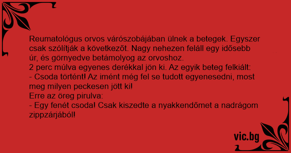 Reumatológus orvos várószobájában ülnek a betegek. Egyszer csak szólítják a következőt. Nagy nehezen feláll egy idősebb úr, és görnyedve betámolyog az orvoshoz.