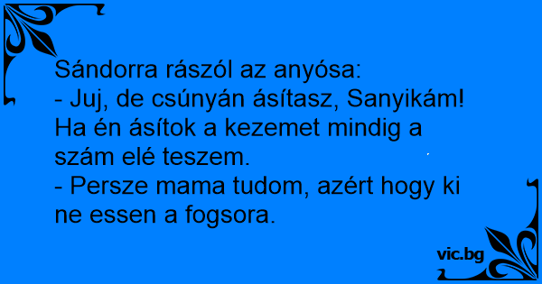 - Juj, de csúnyán ásítasz, Sanyikám! Ha én ásítok a kezemet mindig a szám elé teszem.